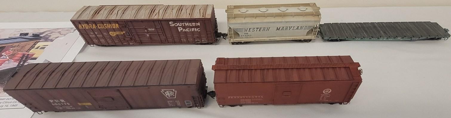 2nd place went to Denny Lippert for his collection of five diverse freight cars, which he described as having just “popped from the shop,” including a Rapido SP waffle boxcar, an Athearn WM centerflow hopper, a Proto-2000 PC flatcar (which he custom-painted), a Branchline 50ft PRR boxcar (which he painted after modifiying the sills), and a new Walthers P2K 40ft boxcar.