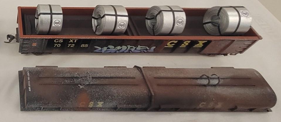 Rick Montgomery entered a pair of coil cars, one depicting the car after it had just been re-shopped, and the other soon after it was put back into service (he added State tool and die coil cradles and US Steel coils), He heavily weathered the car with Pan Pastels and Testors paint markers, and added graffiti (Blair Line decals) to give it the modern touch.