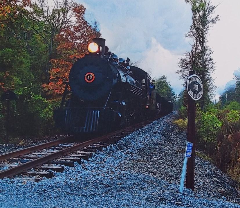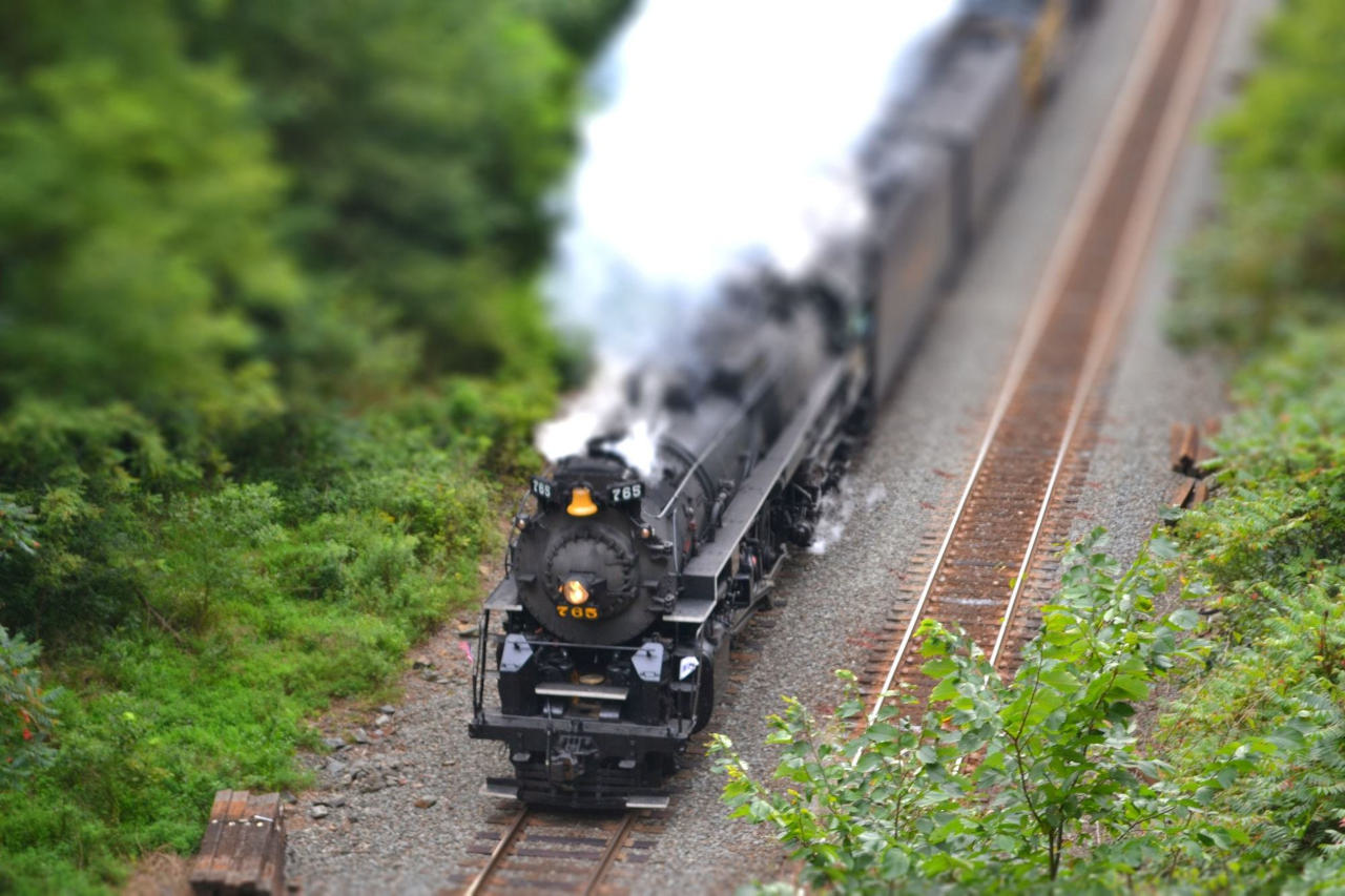 Steve Ross used a “tilt-shift” effect from a website to blur the auxiliary tender and helper diesels in his original prototype photo of NKP Berkshire 765 as it was about to enter Spruce Creek Tunnel on May 26, 2013.