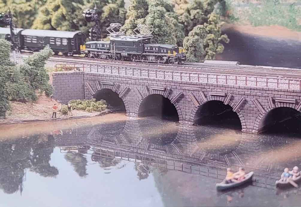 Kevin Squire brought this image of a European electric locomotive (known as the “Krokodil”) pulling a German passenger train across a viaduct in N scale.